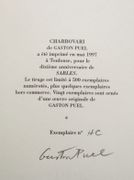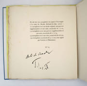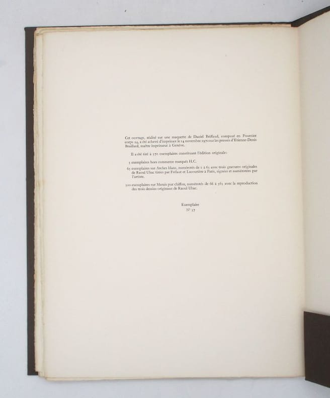 Édition originale illustrée de 5 lithographies en couleurs signées par l'artiste. Un des 20 exemplaires hors commerce tirés sur vélin d'Arches, signé à la justification par l'auteur et l'artiste et comportant une suite des gravures signées tirées sur Japon nacré. * Membre du SLAM et de la LILA / ILAB Member. La librairie est ouverte du lundi au vendredi de 14h à 19h. Merci de nous prévenir avant de passer,certains de nos livres étant entreposés dans une réserve.