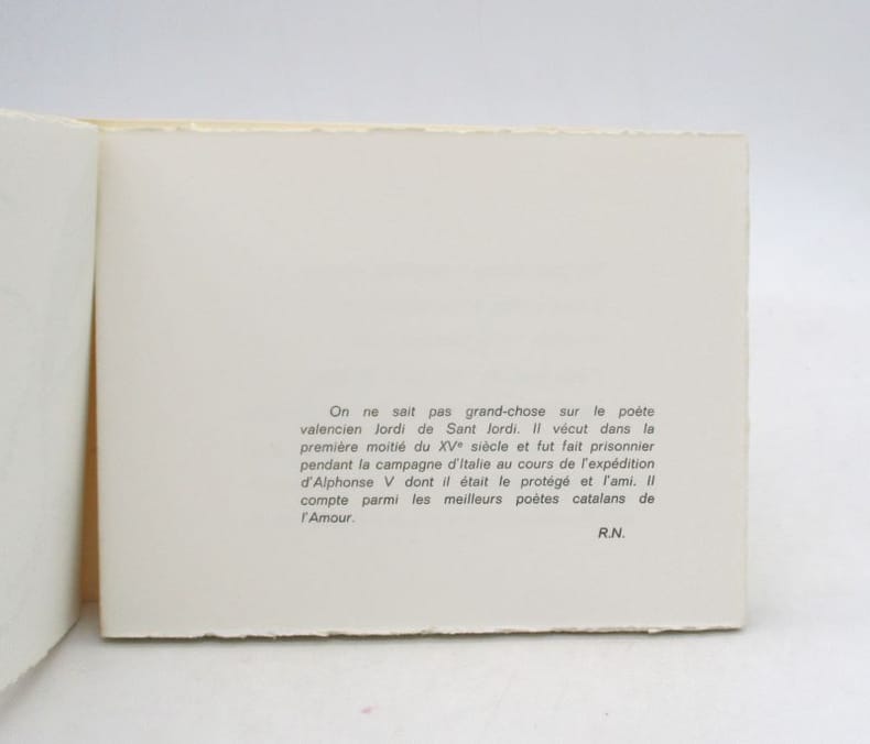 Édition originale bilingue catalan-français, traduite par René Nelli et illustrée d'une gravure en couleurs signée et justifiée par l'artiste. Un des quelques exemplaires hors commerce sur Rives, signé à la justification par l'éditeur et le traducteur. Bel exemplaire. * Membre du SLAM et de la LILA / ILAB Member. La librairie est ouverte du lundi au vendredi de 14h à 19h. Merci de nous prévenir avant de passer,certains de nos livres étant entreposés dans une réserve.
