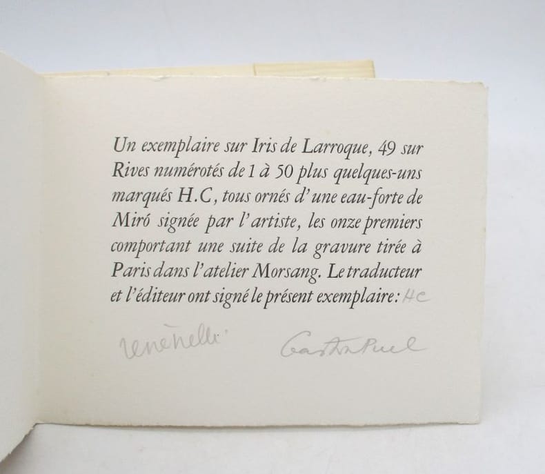 Édition originale illustrée des aquatintes originales de Tal-Coat tirées par l'atelier Crommelynck. Un des 150 exemplaires tirés sur papier d'Auvergne, signé à la justification par l'artiste et l'auteur. * Membre du SLAM et de la LILA / ILAB Member. La librairie est ouverte du lundi au vendredi de 14h à 19h. Merci de nous prévenir avant de passer,certains de nos livres étant entreposés dans une réserve.