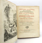 Édition originale de cette monographie consacrée aux roches et aux coquillages. Elle comprend un lexique des mots latins ou grecs traduits en français et deux chapitres sur l'arrangement et les plus célèbres cabinets d'histoire naturelle européens. Elle est joliment illustrée d'un frontispice gravé par Chedel d'après François Boucher et de 32 planches comportant chacune plusieurs figures. Brunet, II, 23. Bon exemplaire. * Membre du SLAM et de la LILA / ILAB Member. La librairie est ouverte du lundi au vendredi de 14h à 19h. Merci de nous prévenir avant de passer,certains de nos livres étant entreposés dans une réserve.