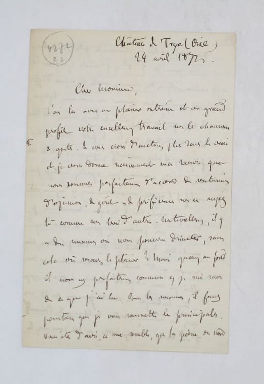 Château de La Trye (Oise), 24 avril 1872. In-8, 4 pp.