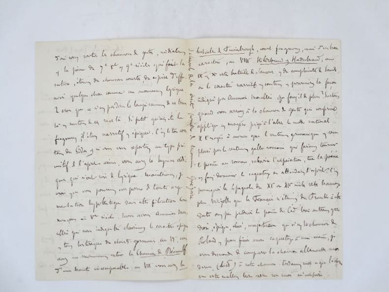 Lettre autographe signée à Charles d'Héricault qu'il félicite pour son "excellent travail sur les chansons de geste", sans doute son Essai sur l'origine de l'épopée française et sur son histoire au Moyen âge. Il disserte longuement sur les formes que ces chants peuvent prendre, leurs origines, notamment germaniques ou nordiques, et cite l'Edda, La Chanson de Béowulf ou encore le lied allemand. * Membre du SLAM et de la LILA / ILAB Member. La librairie est ouverte du lundi au vendredi de 14h à 19h. Merci de nous prévenir avant de passer,certains de nos livres étant entreposés dans une réserve.
