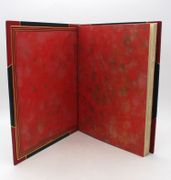 Paris, imprimé pour les Amis des livres par Motteroz, 1883. In-8, 345 pp., maroquin rouge de David, deux triples filets dorés en encadrement sur les plats dont un orné de fleurons et d'arabesques végétales dorés, dos à nerfs orné de caissons et fleurons dorés, encadrement intérieur de maroquin rouge orné d'une dentelle dorée, doublure de maroquin indigo ornée de filets, d'une dentelle et de fleurons dorés, tranches dorées, couverture conservée, chemise à rabats à dos de basane rouge, étui bordé de même (manque et épidermures au dos de la chemise et à l'étui, dos très légèrement insolé).
