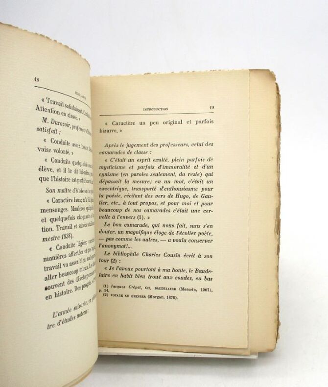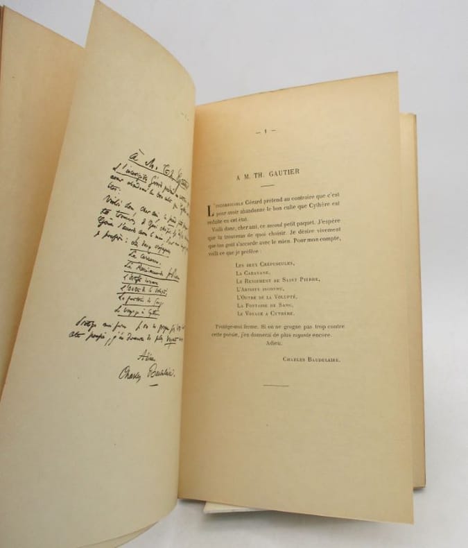 Édition de ce recueil à trois mains qui originalement aurait dû comprendre des contributions de Charles Baudelaire. Il contient 40 pièces de Levavasseur, 41 de Prarond et 54 d'Argonne. Les 4 poètes se sont rencontrés à la pension de Lévêquet et Bailly de Paris en 1837. C'est Lavavasseur et Pararond qui eurent l'idée du présent ouvrage, ils proposèrent à Baudelaire de contribuer, ce qu'il accepta. C'est lui qui proposa aux deux premiers de collaborer avec Auguste Dozon dit Argonne. Baudelaire remit son manuscrit à Levavasseur qui non seulement lui fit son commentaire mais entreprit de le corriger. Ce qui poussa Baudelaire à se retirer du projet. Levavasseur expliqua par la suite qu'il s'agissait de premières ébauches de pièces qui parurent dans Les Fleurs du mal. La trace de Baudelaire est pourtant là : deux des sonnets de Prarond lui sont dédiés (le XXVIIIe p. 125 et le XXXIIIe p. 133). Levavasseur conclut que Baudelaire avait bien fait de se retirer car "son étoffe était d'une autre trame que notre calicot". Peu commun. Ex-libris manuscrit de monsieur Nion (le libraire ?) sur le premier plat de couverture. Brunet, Dictionnaire des ouvrages anonymes, 5e; Vicaire, V, 305; Mouquet, "Manoël [...]" in Le Figaro - Supplément littéraire, n°466, 10 mars 1928, p. 1 [en ligne]. Voir photographie(s) / See picture(s) * Membre du SLAM et de la LILA / ILAB Member. La librairie est ouverte du lundi au vendredi de 14h à 19h. Merci de nous prévenir avant de passer,certains de nos livres étant entreposés dans une réserve.