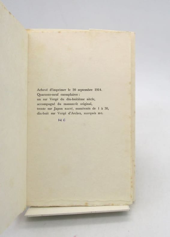Édition originale de ce recueil rédigé en 1914. Un des 30 exemplaires sur japon nacré, deuxième papier après 1 sur vergé du XVIIIe siècle, celui-ci marqué H.C. * Membre du SLAM et de la LILA / ILAB Member. La librairie est ouverte du lundi au vendredi de 14h à 19h. Merci de nous prévenir avant de passer,certains de nos livres étant entreposés dans une réserve.
