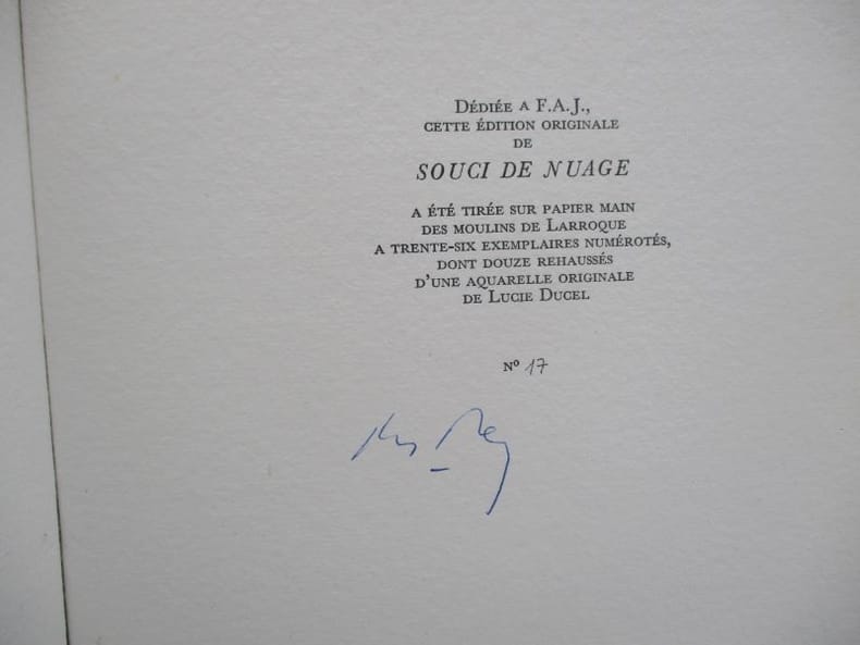 Edition originale, UN DES 23 exemplaires sur papier vélin bleu. ENVOI autographe signé de l'auteur à Georges Oudard, "son vieux patron et son jeune ami". * Voir photographie(s) / See picture(s). * Membre du SLAM et de la LILA / ILAB Member. La librairie est ouverte du lundi au vendredi de 14h à 19h. Merci de nous prévenir avant de passer,certains de nos livres étant entreposés dans une réserve.